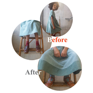 Our design-led collection is created from fabrics that allow many styles to grow with children and allow up-cycled added details.